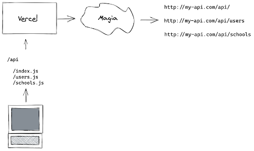 Esta sutil diferencia hace que lo único que tengamos que hacer es escribir el código que se dedica a cada ruta y Vercel se encarga de que cada archivo se transforme en una ruta de nuestra API. Además que por cada petición a nuestra API, Vercel va a ejecutar la función que corresponda en ese momento como si fuera un programa separado. Eso quiere decir que si mucha gente entra simplemente va a ejecutar la misma función muchísimas veces y todas las peticiones obtendrán su respuesta sin congestionar el server.