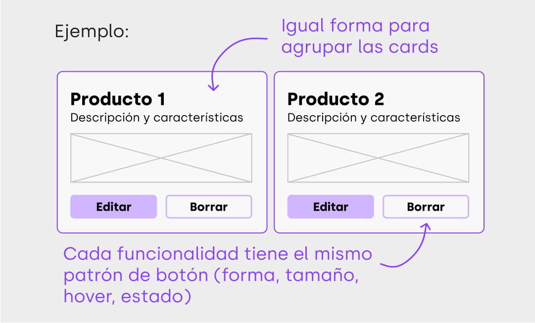 Supongamos que todos los botones de acción de una página tienen el mismo color, forma y efecto de hover. Intuitivamente los vamos a interpretar de mejor manera porque, como ya hablamos en otro tip, no leemos las páginas web, las escaneamos. Es decir, buscamos constantemente este tipo de patrones que nos ayuden a entender de un pantallazo lo que podemos hacer para navegar en un sitio.