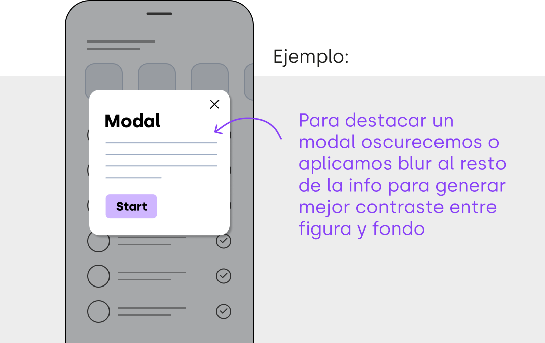 Este principio es muy utilizado cuando colocamos un modal en una página. En general, cuando se activa el modal, se suele oscurecer o blurear el fondo, para que ese elemento destaque y el resto de la información no entorpezca su funcionalidad.