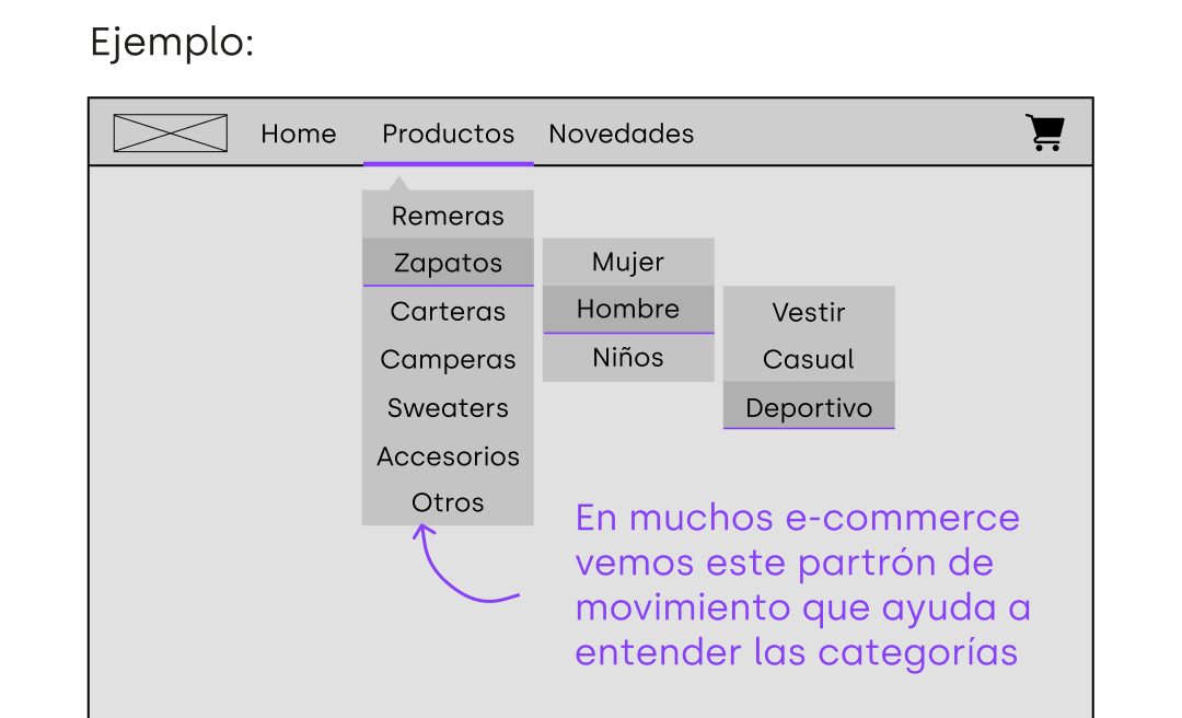 Este principio se aplica, por ejemplo, en barras de navegación complejas, donde aparecen varios elementos desplegables, como en las categorías de los e-commerce.