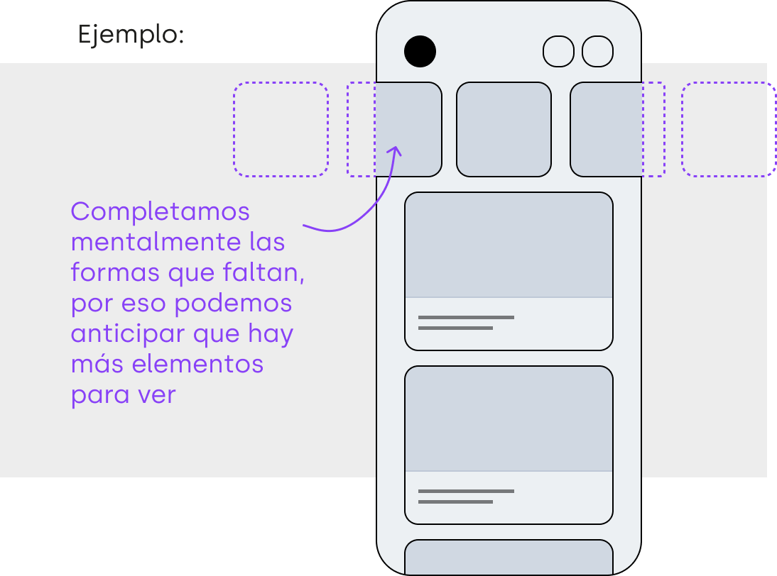 Este principio se puede ver en los carruseles de imágenes, en especial en las versiones mobile, donde sabemos que existen múltiples imágenes aunque no podamos verlas enteras. Esto sucede porque nuestro cerebro “autocompleta” las partes faltantes y nos ayuda a entender que aún hay más para ver. Por eso los carruseles y scrolleos infinitos resultan tan satisfactorios.